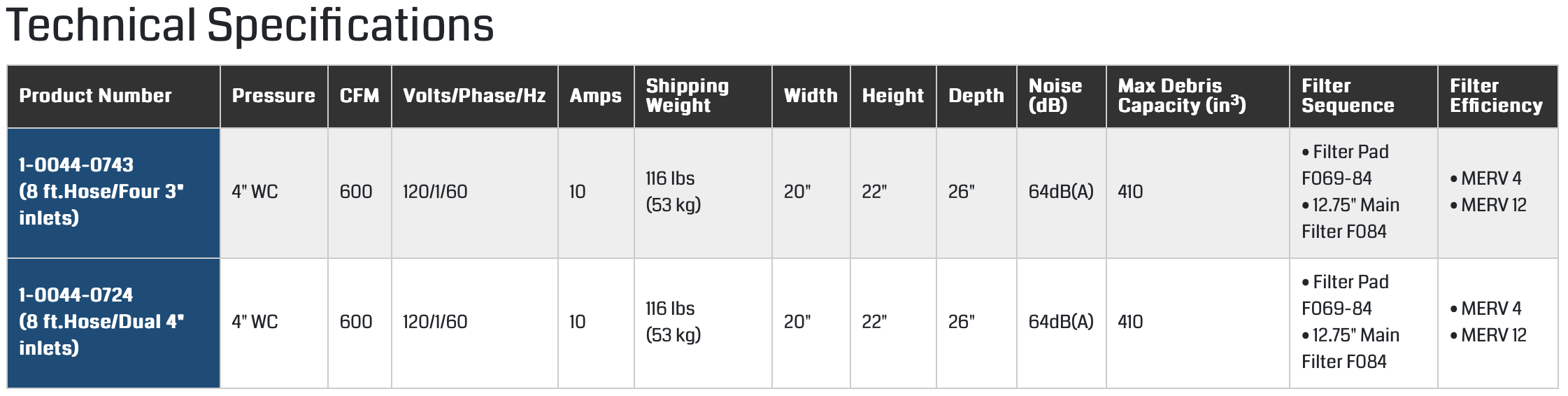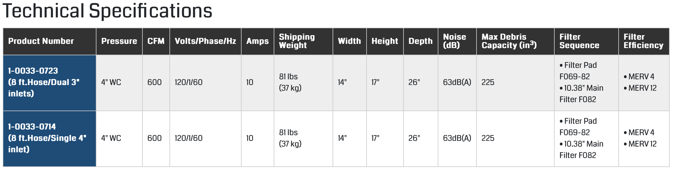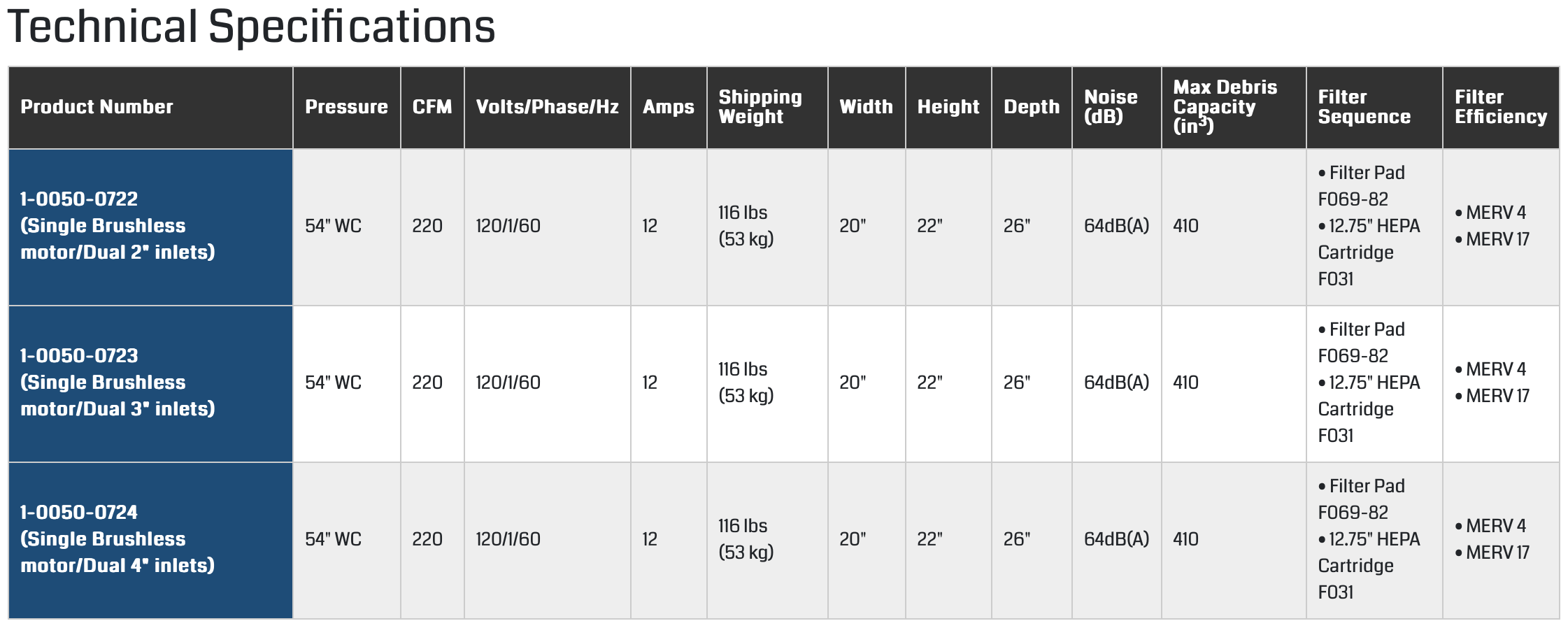 The AeroVac V4 HEPA Cartridge Dust Collector offers high-pressure dust collection with multi-stage filtration. Ideal for multiple users, the AeroVac V4 features a durable, maintenance-free Brushless industrial motor along with a large debris storage tray for easy clean up. Available with your choice of dual 2", 3" or 4" inlets. Mechanical cartridge seal is included.