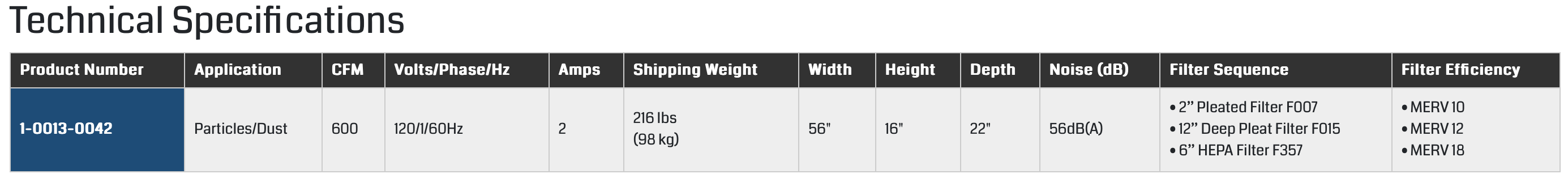 Features: Up to six (6) air exchanges per hour, Multi-stage HEPA filtration, Up to 3,750 ft² coverage, Intelligent control panel featuring, digital speed control and audible/visual alarms., Ducted unit designed to exhaust contaminated air outdoors