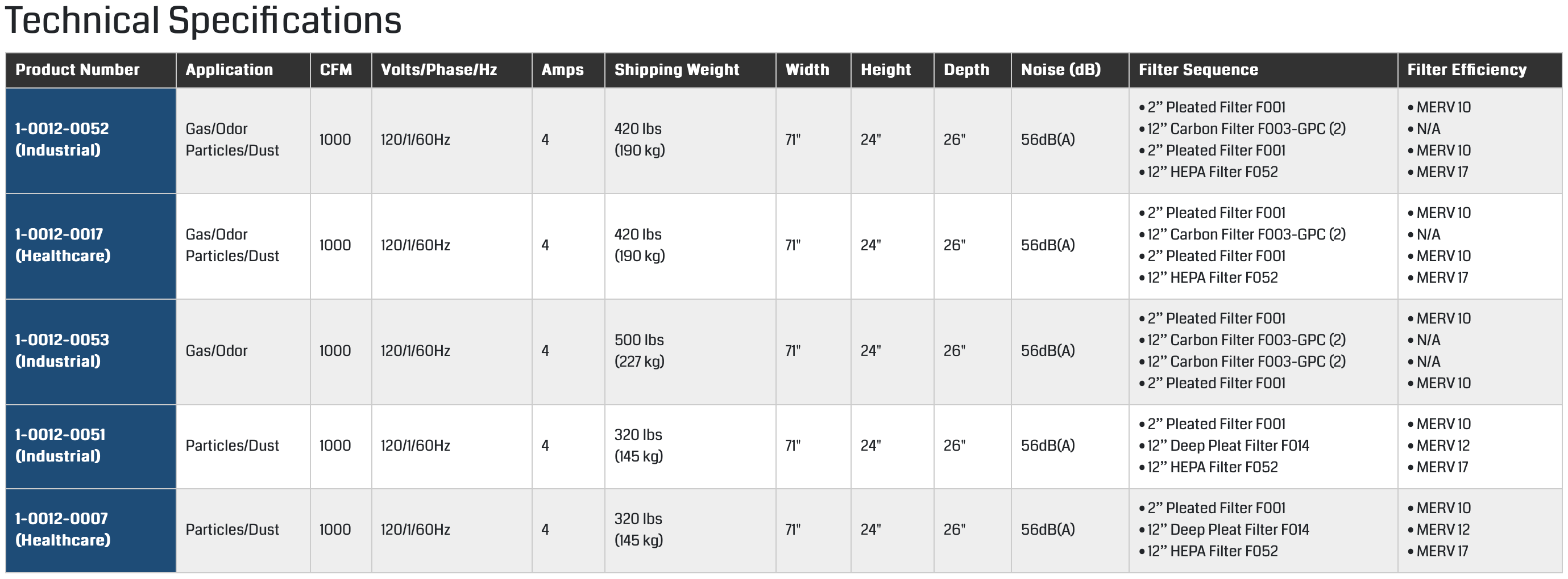 Designed to handle high concentrations of chemicals, gases, odors, particles and biological contaminants. 1000 nominal CFM.