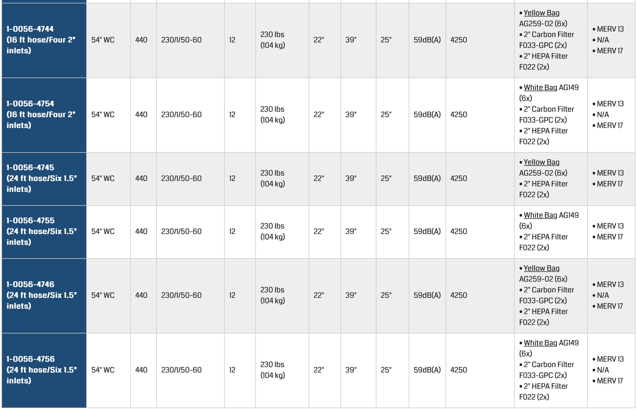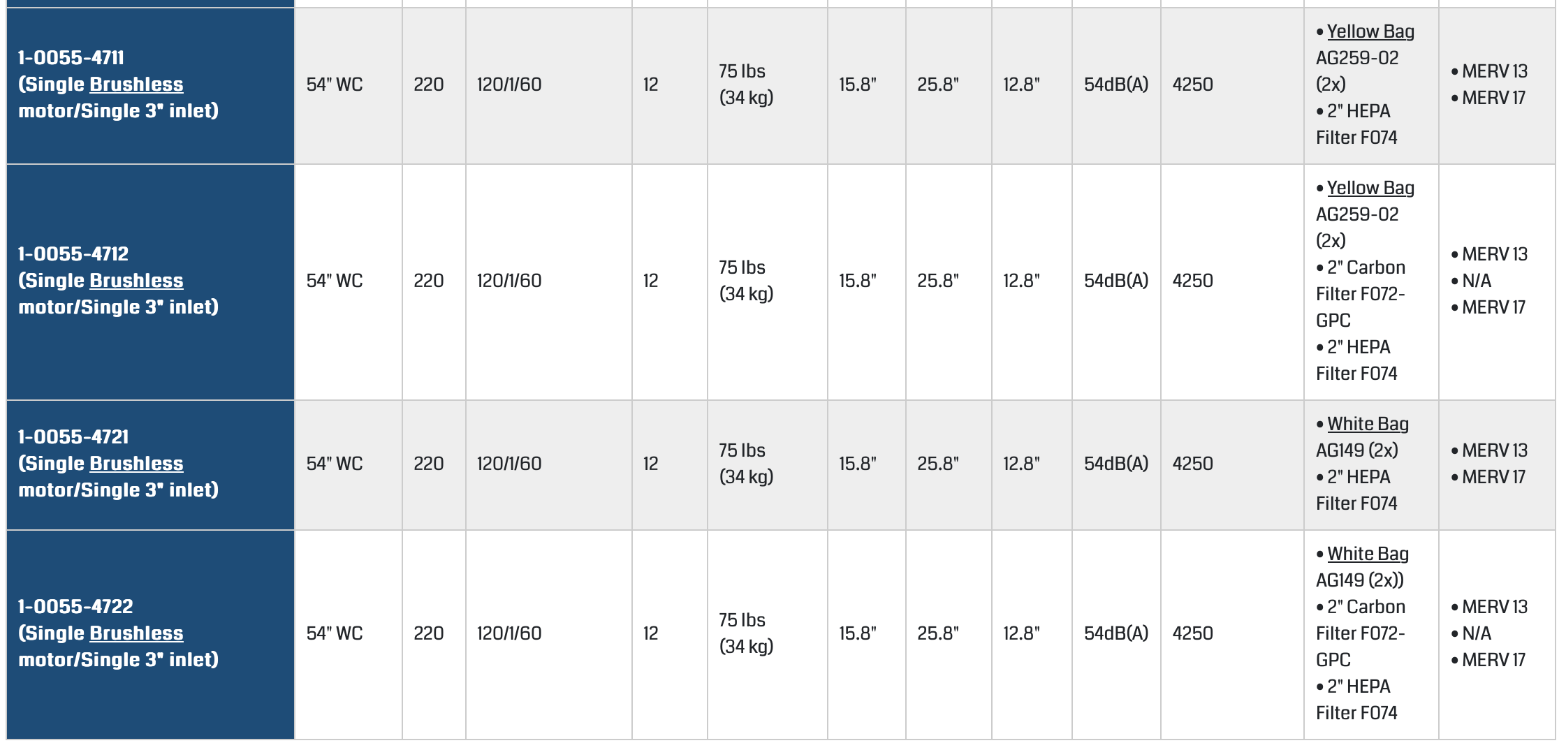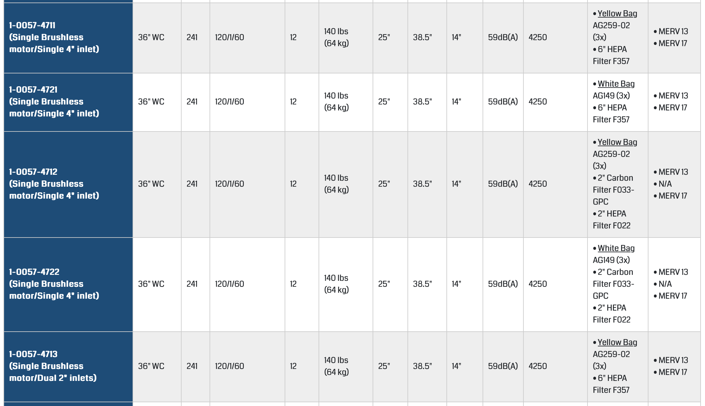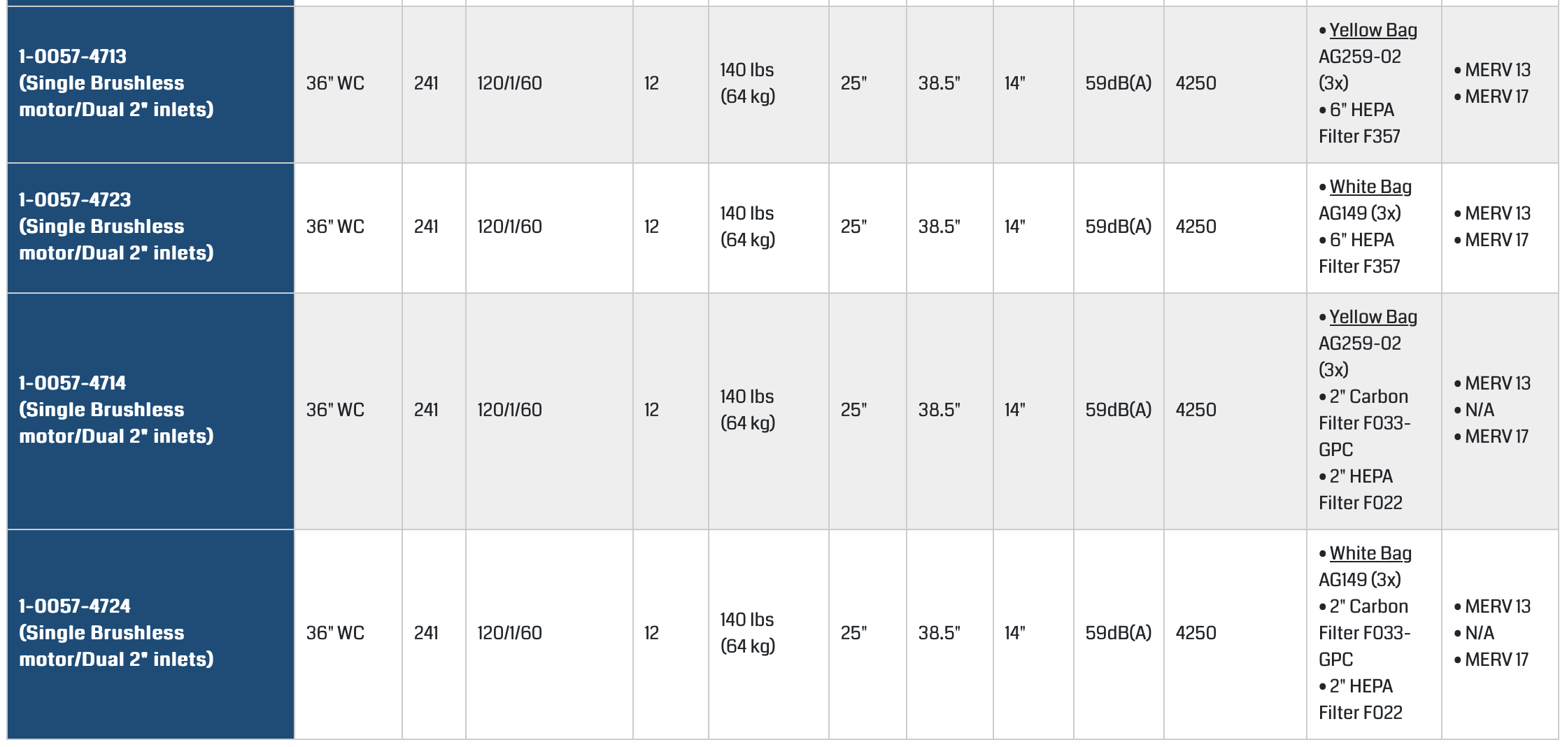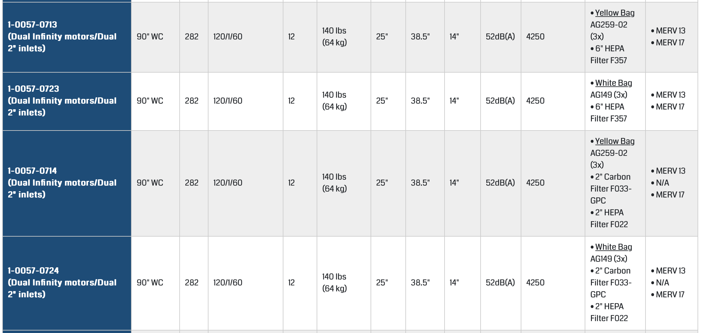 Options: Infinity or Brushless motors, Yellow or White bag filter, Single or dual, top or side inlet(s) - multiple diameters available