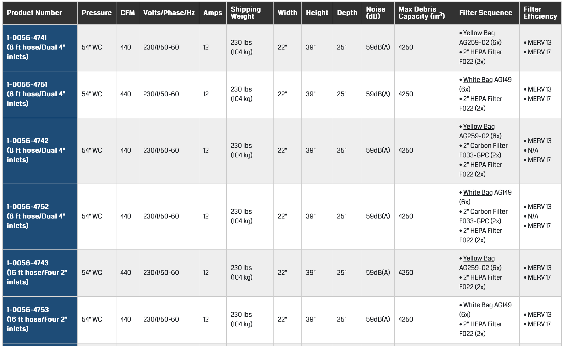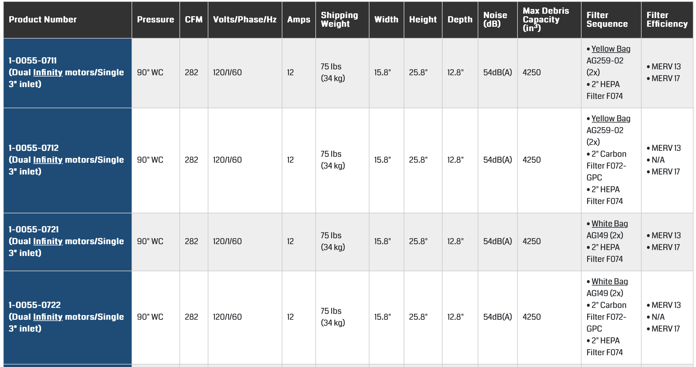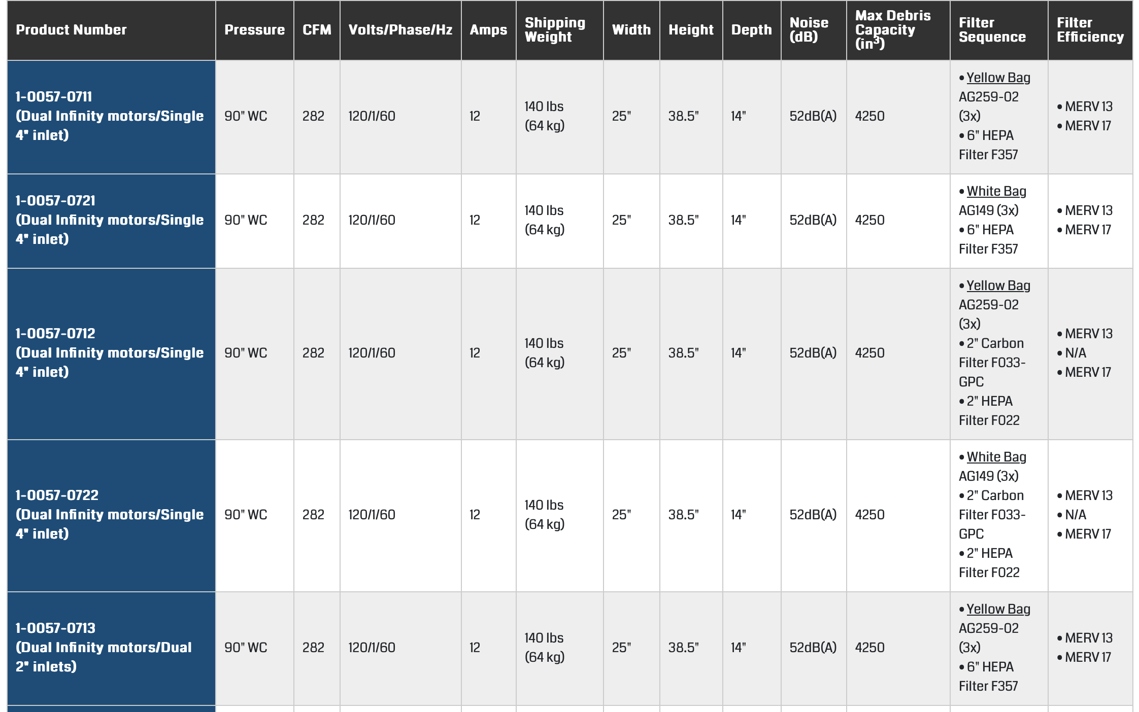 Options: Dual Infinity or single Brushless motor(s), Yellow or White bag filter, Top or side inlet (1.5", 2", 3", or 4"), Multiple filter sequence configurations, Source capture arms